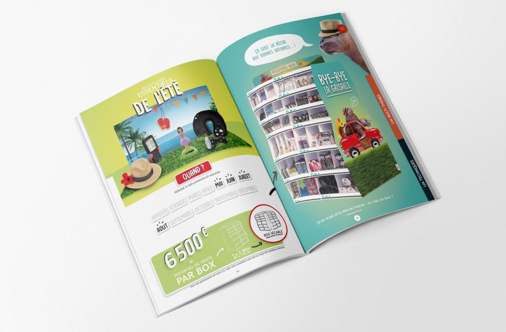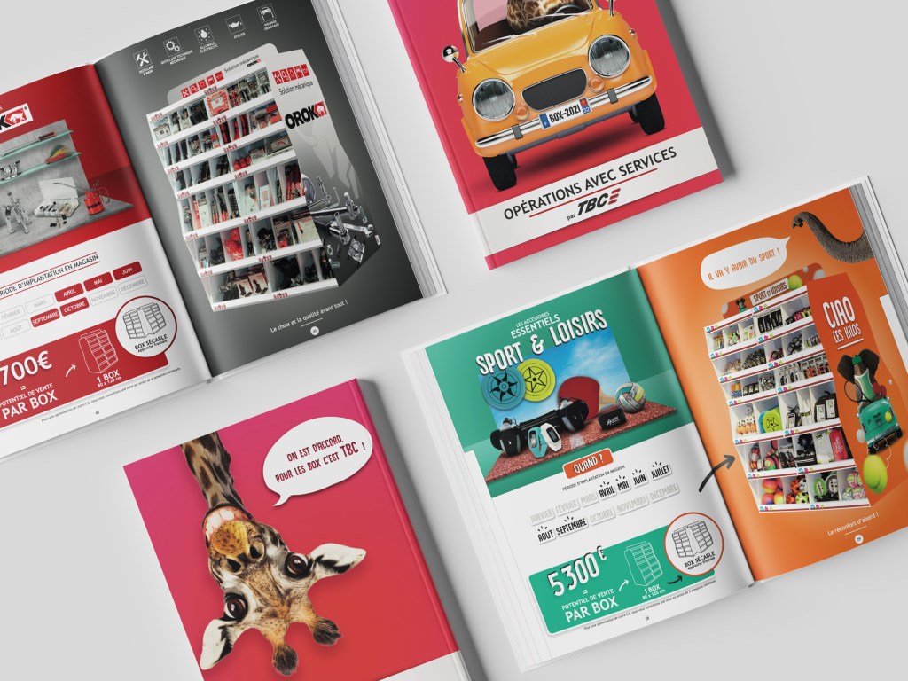 Conception complète du catalogue annuel de box thématiques « prêt-à-vendre », outil de communication essentiel pour les équipes commerciales.
